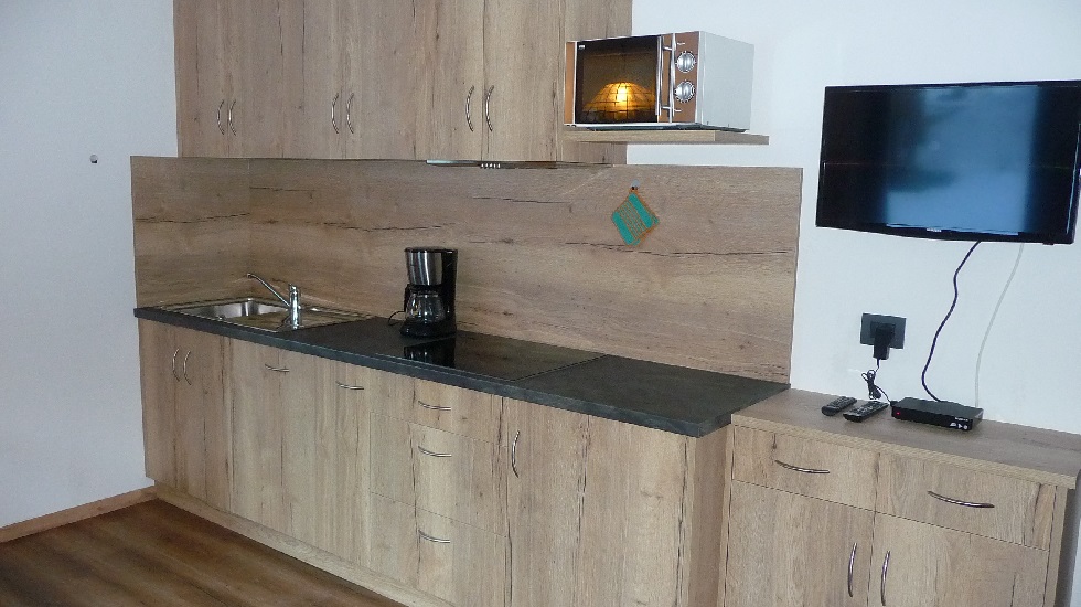 Nuovo ampio e luminoso ambiente soggiorno-cucina con piastra elettrica in vetroceramica nell'appartamento al primo piano.